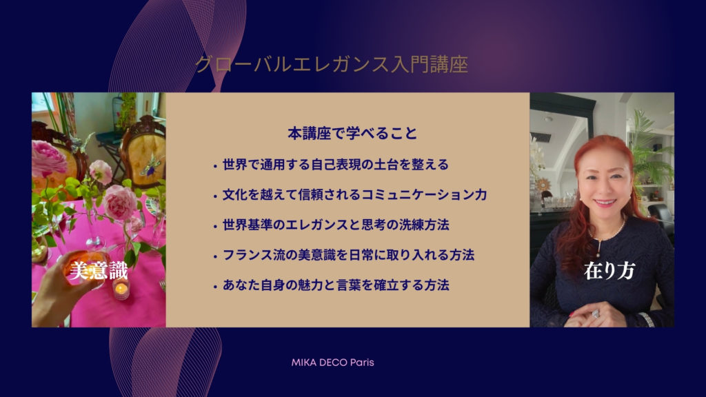 グローバルエレガンスのエッセンスを、ぎゅっと4時間で体験していただきます。